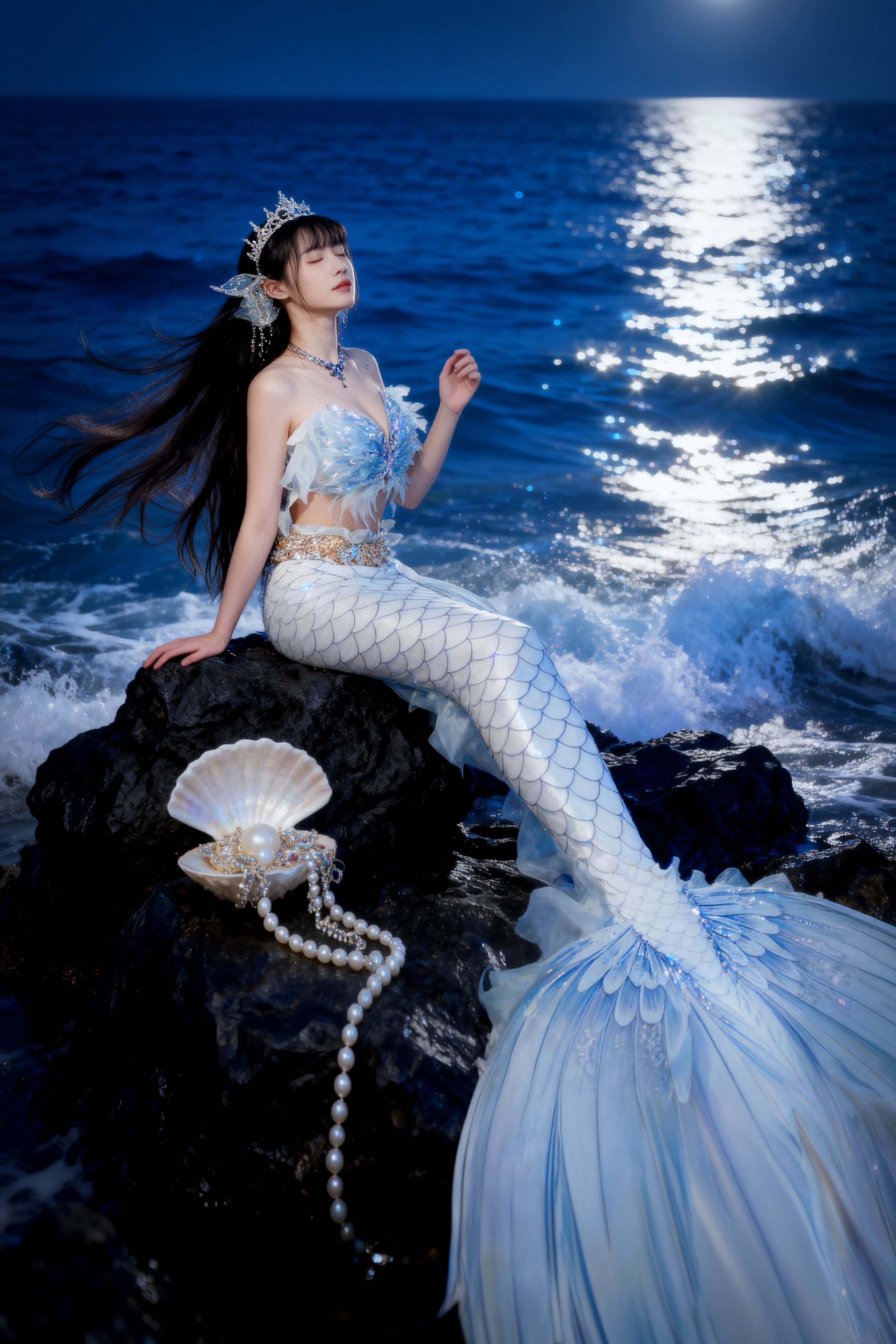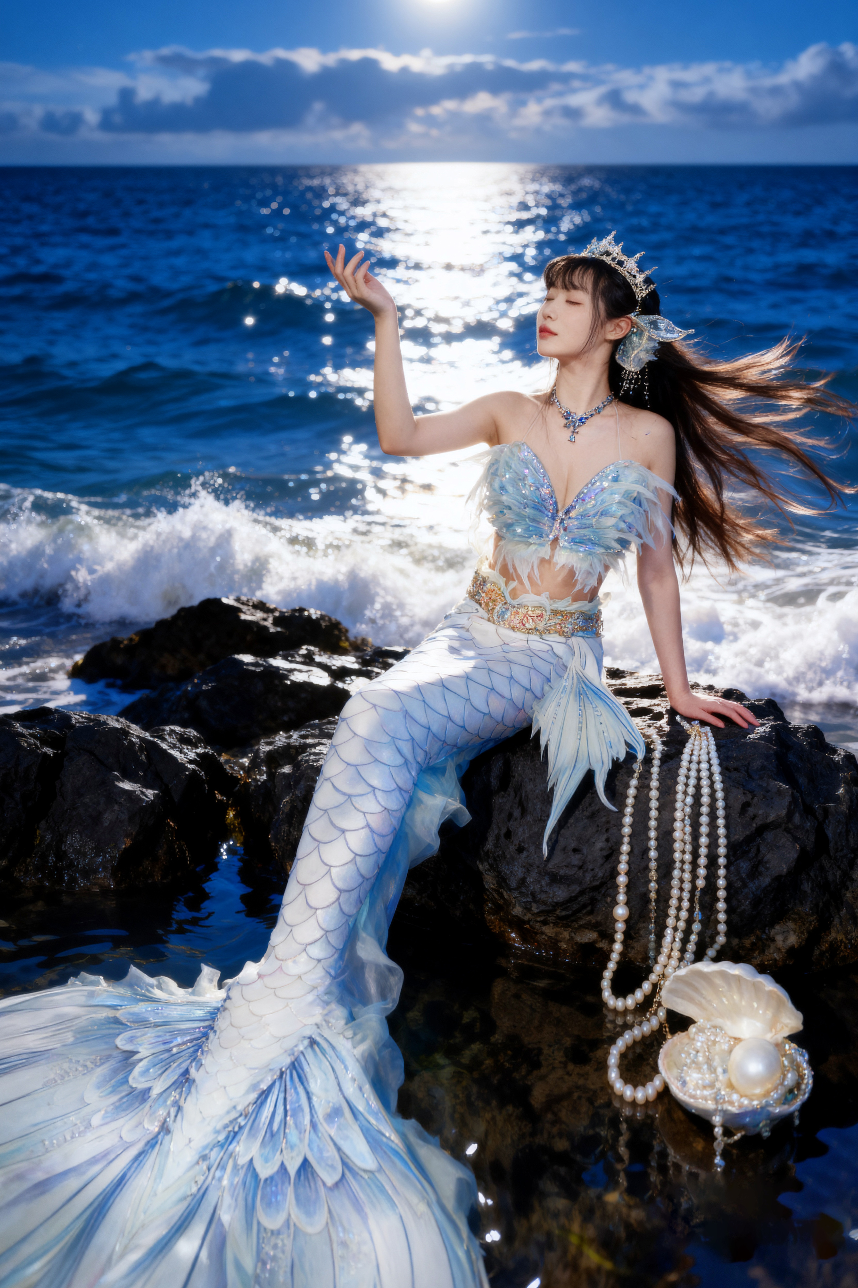 髮絲間纏繞著被時間遺忘的珍珠。 她是深海裡最孤高的存在, 優雅,卻帶著一絲不易察覺的憂鬱。 只有海浪知道,這份純粹的美麗有多麼動人心弦。