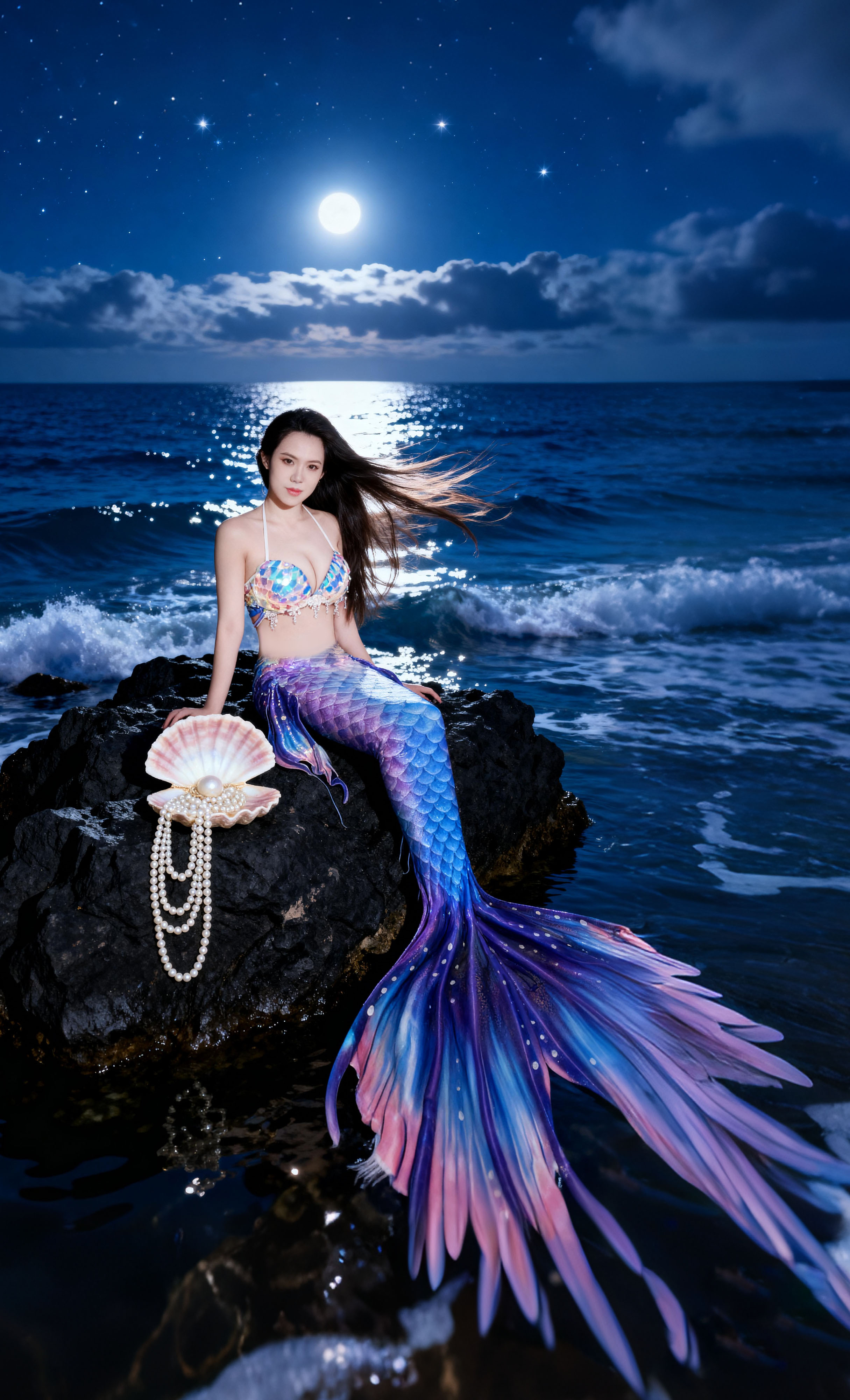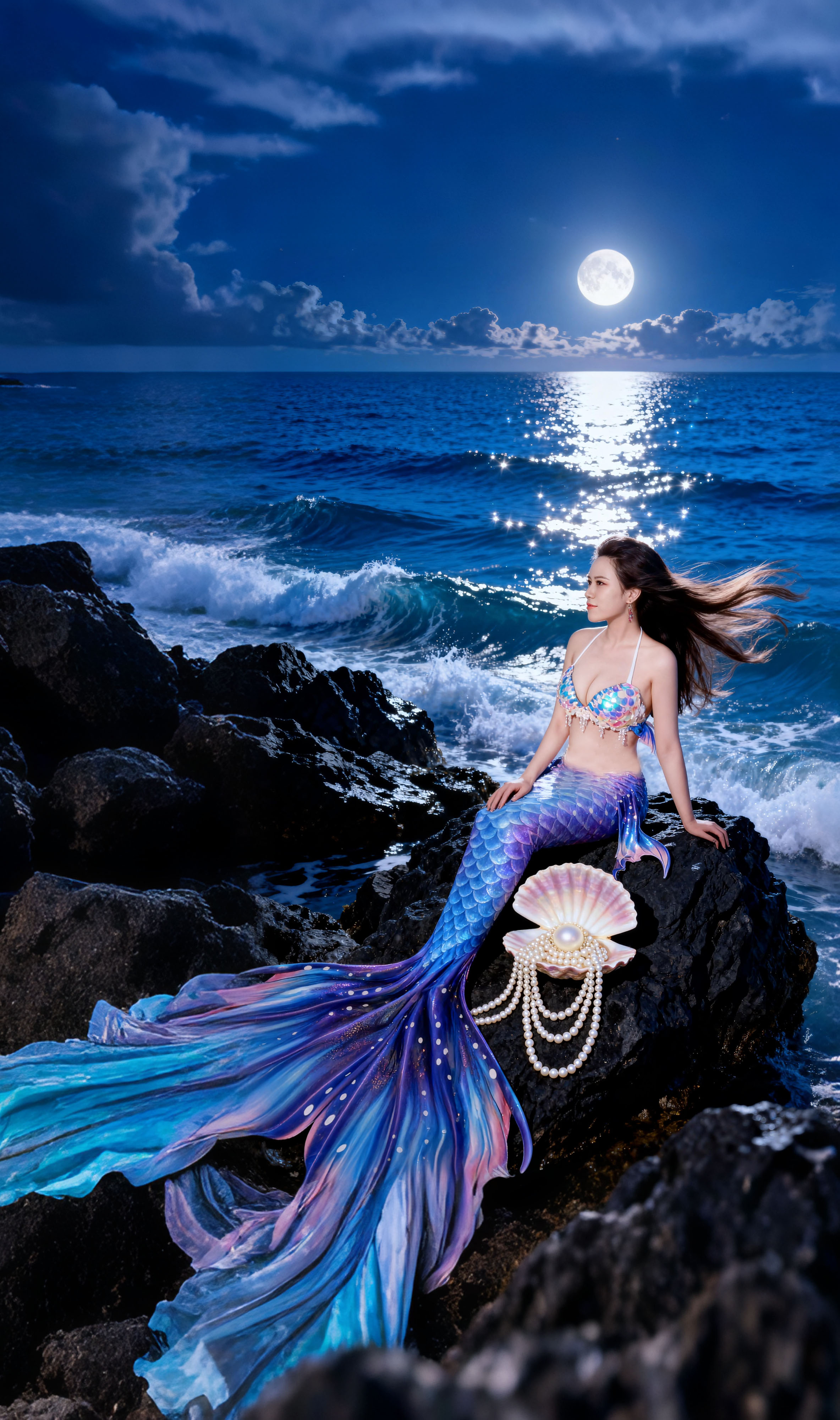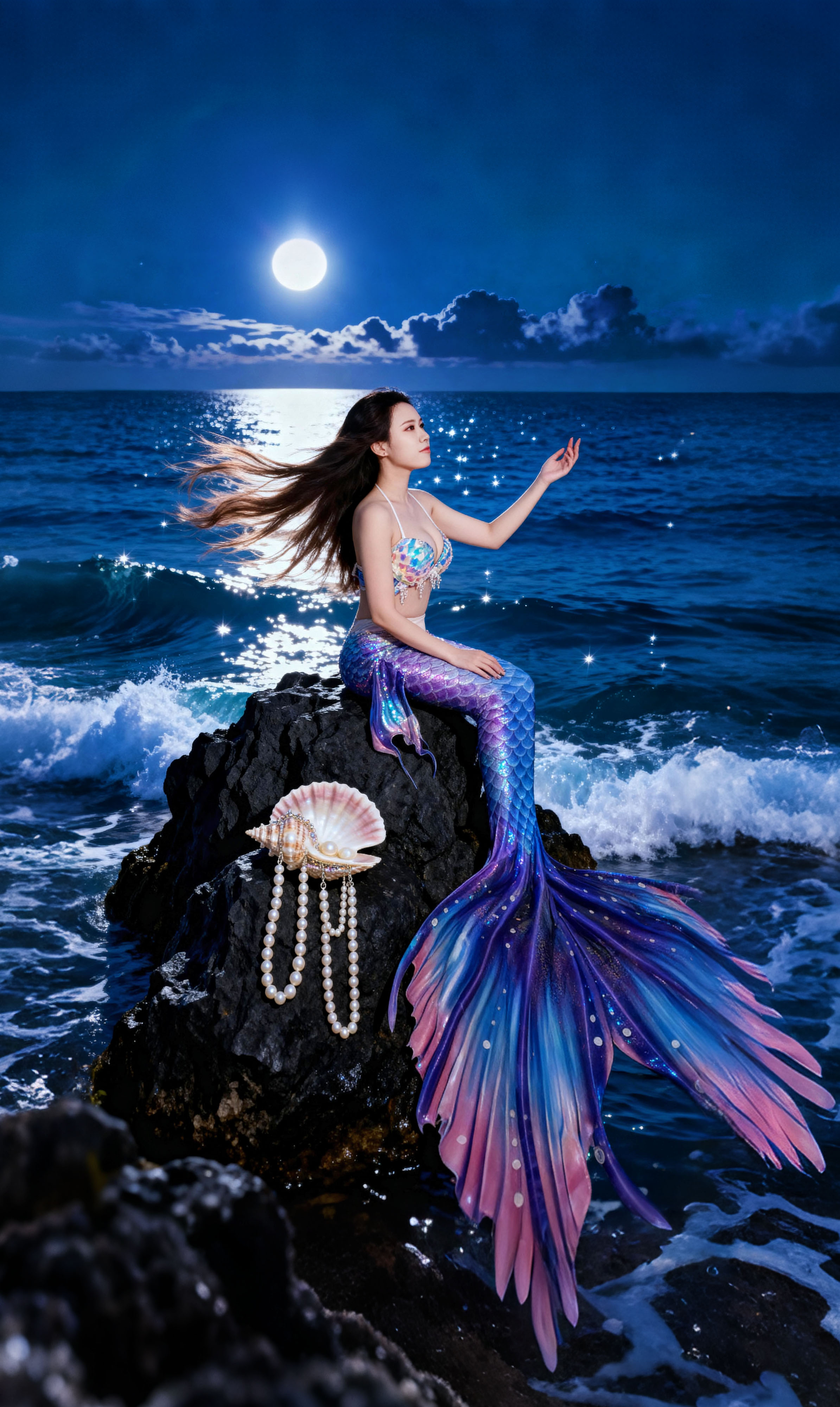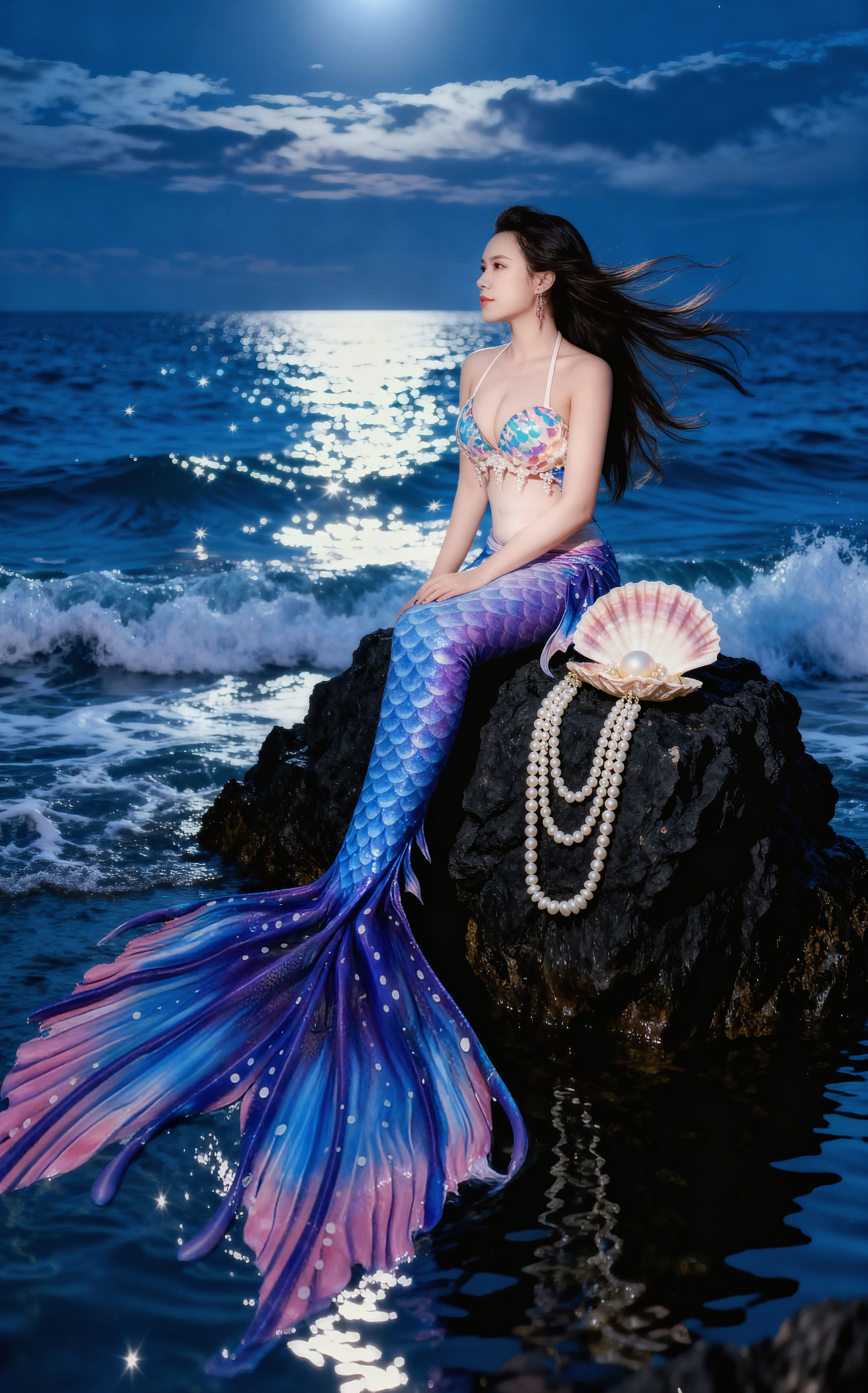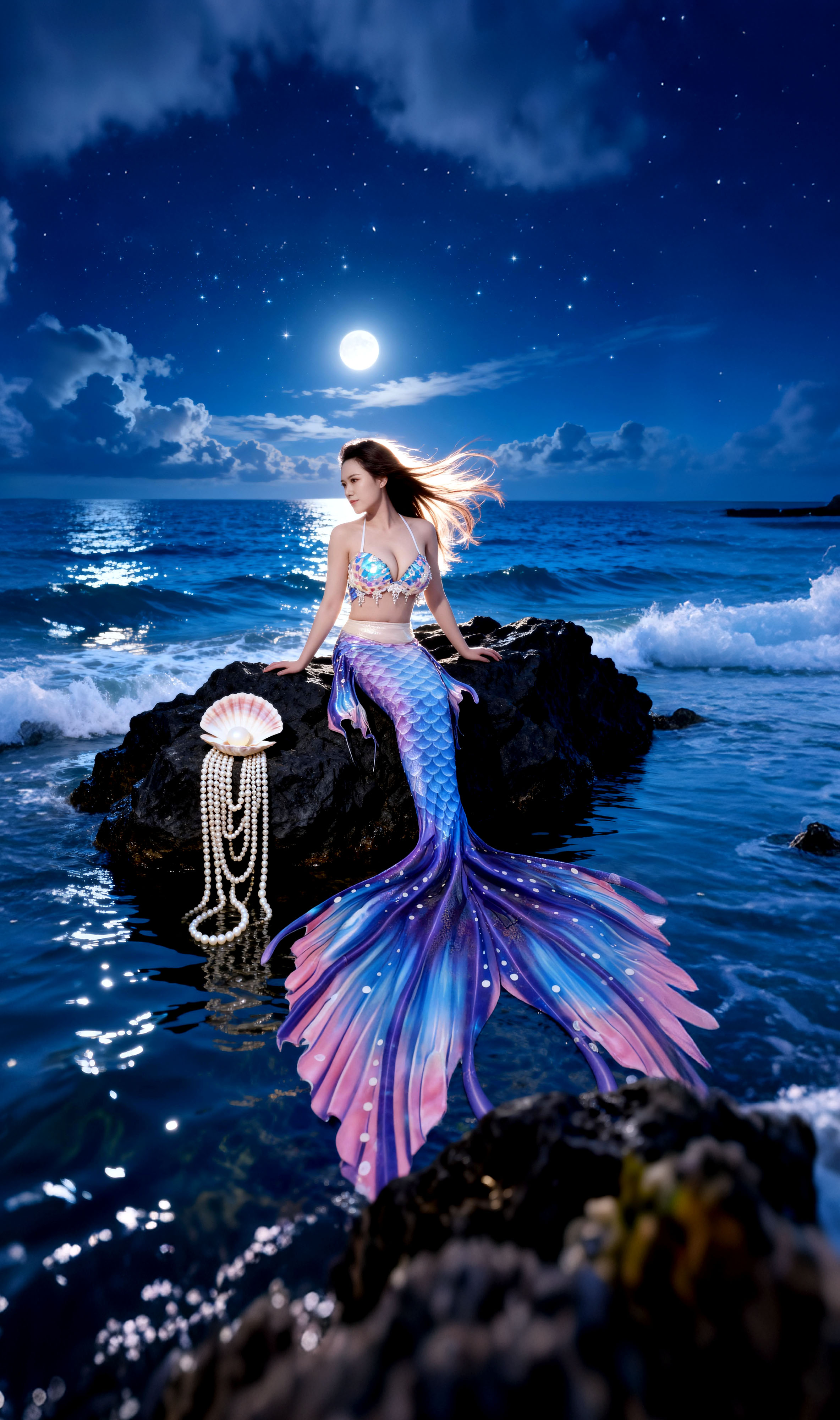 髮絲間纏繞著被時間遺忘的珍珠。 她是深海裡最孤高的存在, 優雅,卻帶著一絲不易察覺的憂鬱。 只有海浪知道,這份純粹的美麗有多麼動人心弦。